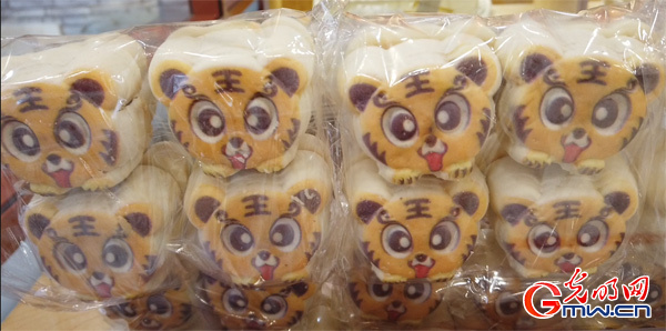 除了穿戴,食品中的“虎”元素也必不可少。在中華老字號(hào)北京稻香村,一款名為“大王餅”的糕點(diǎn)被擺在十分顯眼的位置?!按笸躏灐蓖庥^上看是一個(gè)呆萌可愛(ài)的老虎頭,內(nèi)有雞肉松餡兒?;⒛昙磳⒌絹?lái),“大王餅”頗受歡迎?!爸苣┛土髁看髸r(shí),每天可以賣(mài)掉四五百塊?!北本┑鞠愦?前門(mén)店)店員說(shuō)。