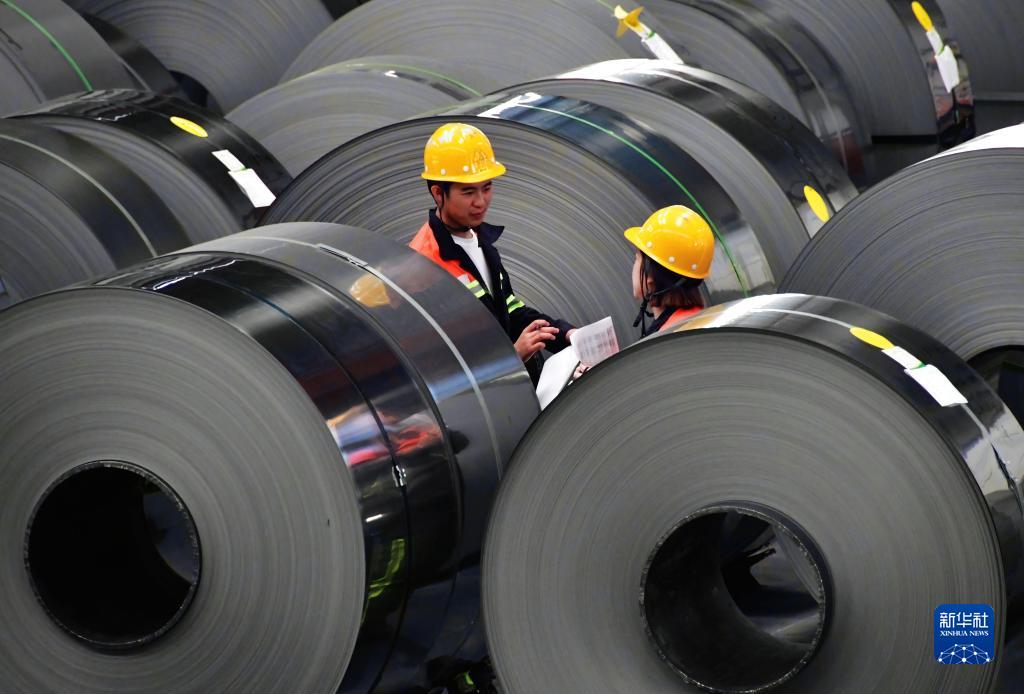 兩名質檢員在福安青拓冷軋科技有限公司生產(chǎn)車間檢查不銹鋼卷成品(2022年8月17日攝)。新華社記者 魏培全 攝