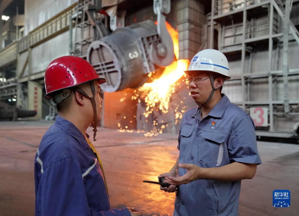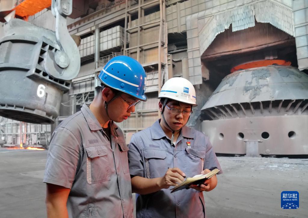 邯寶煉鋼廠特檔技術主管、轉爐車間副主任唐笑宇(右)在轉爐車間與工友交流(2022年9月7日攝)。新華社記者 楊世堯 攝