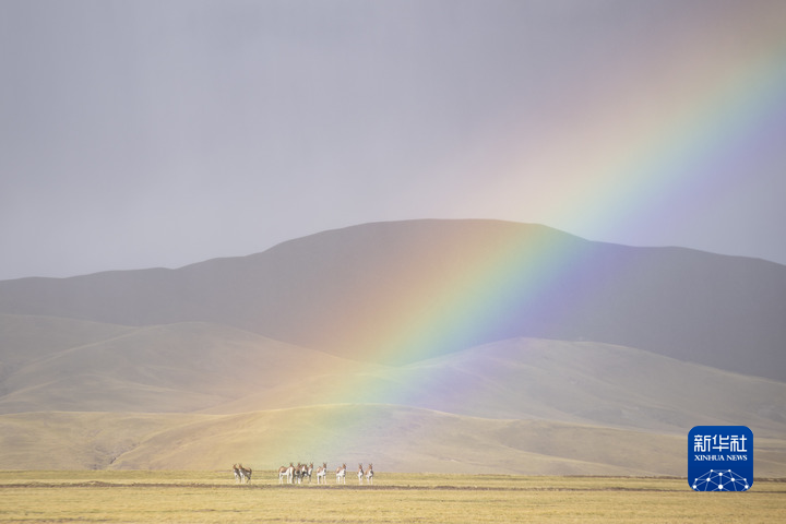 彩虹下的羌塘國家級自然保護區(qū)藏野驢。新華社記者 孫瑞博 攝