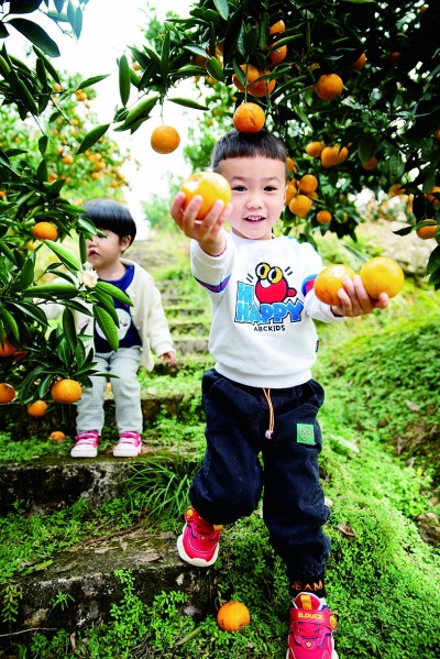 孩子們?cè)诤笔∫硕际懈邏沃捩?zhèn)陳家崗村鳳凰山柑橘基地采摘柑橘。宜都市委宣傳部供圖