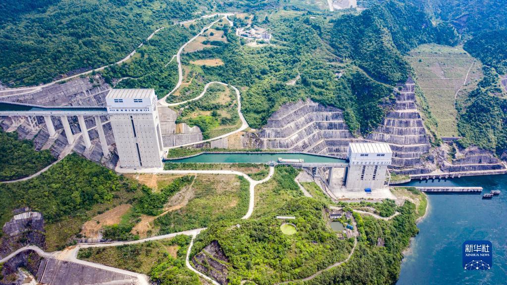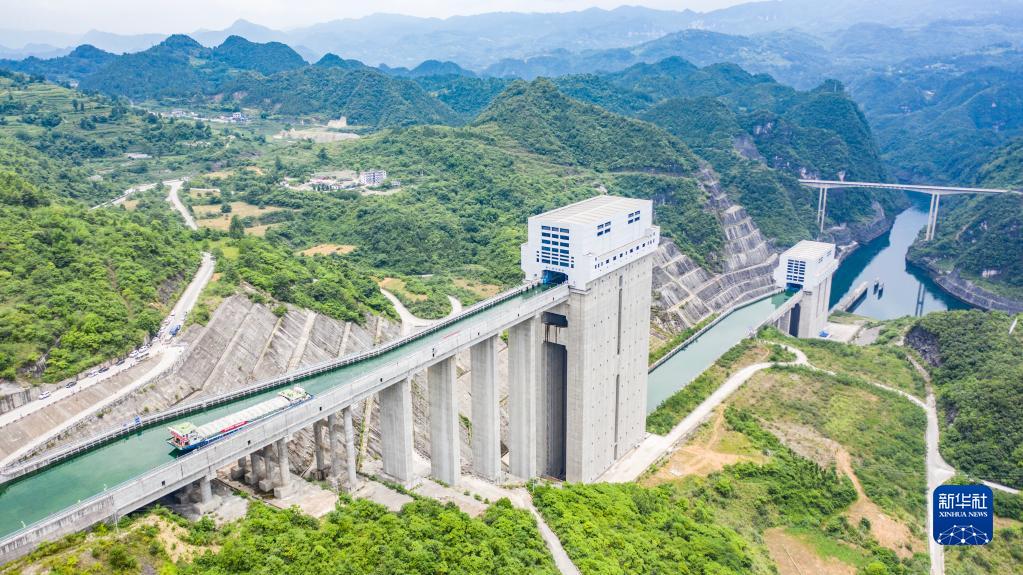 2021年6月投入試運(yùn)行的構(gòu)皮灘水電站配套的通航工程,被視為貴州通江達(dá)海的關(guān)鍵。構(gòu)皮灘通航水頭高差達(dá)199米,采用三級(jí)垂直升船機(jī)運(yùn)行,船只通過(guò)烏江構(gòu)皮灘水電站都要搭乘“水上電梯”,呈現(xiàn)出“水在空中懸,船在天上行”的奇景。
