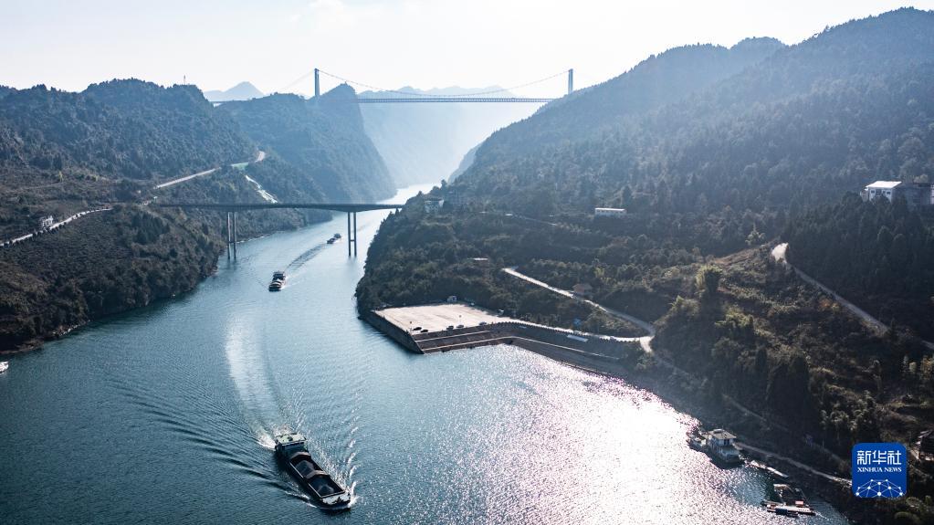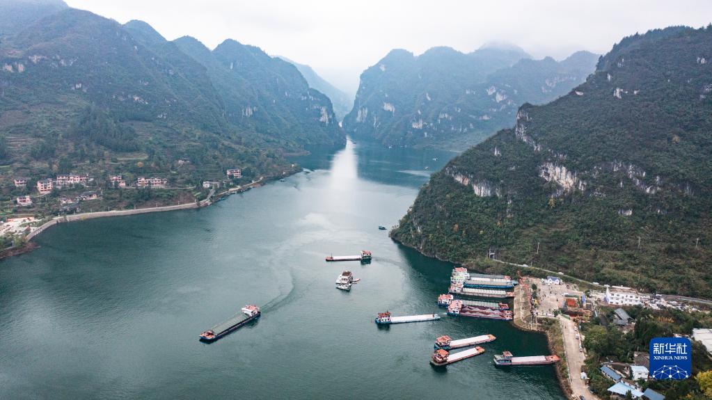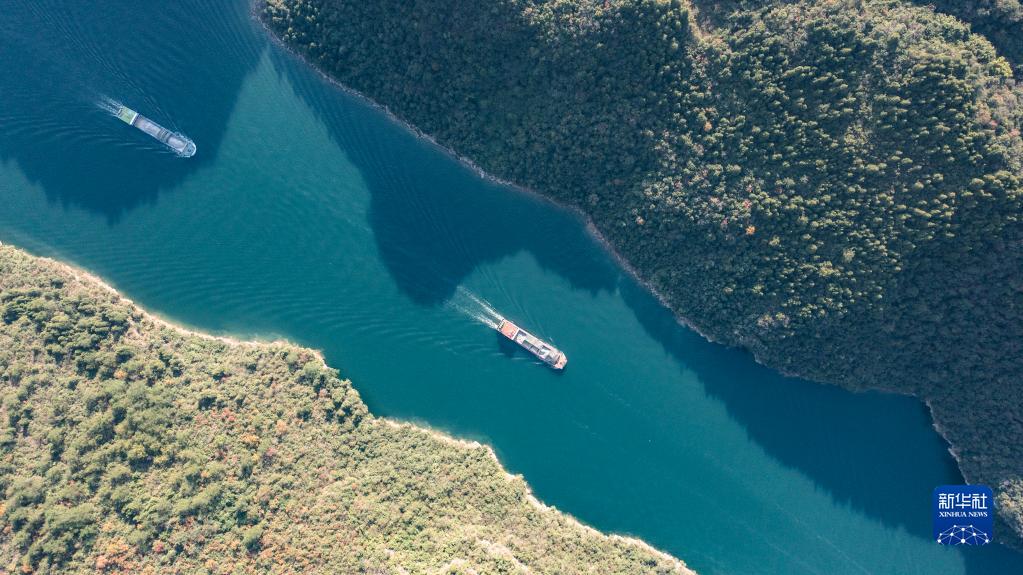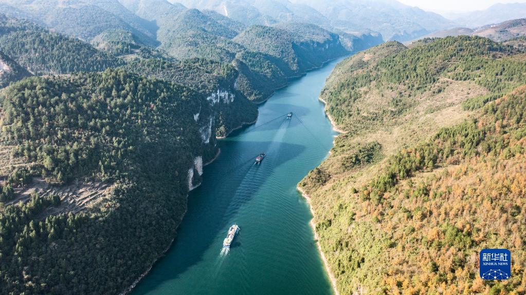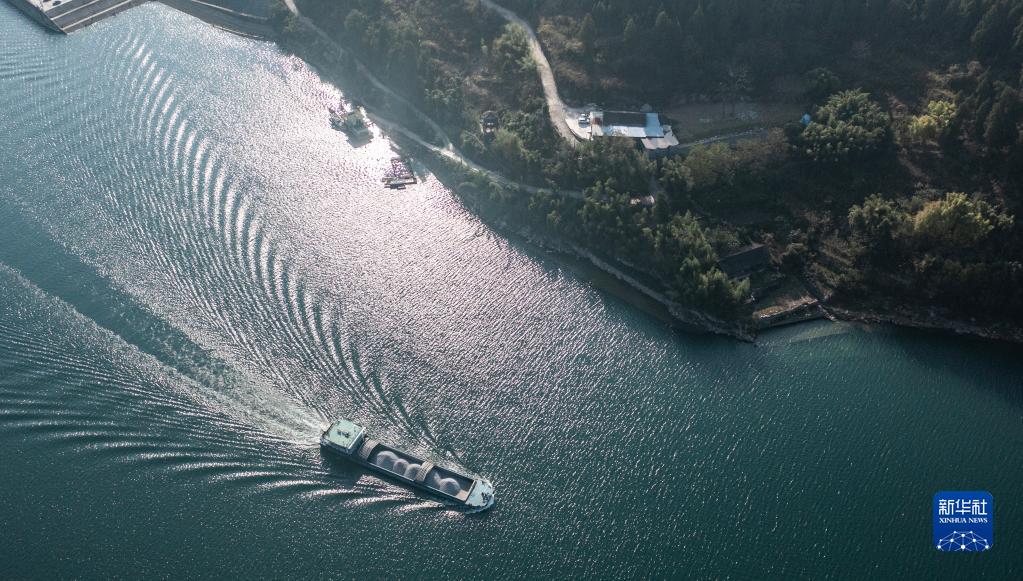 運(yùn)載磷礦石的貨船沿烏江航道順流航行(2021年11月18日攝,無(wú)人機(jī)照片)。新華社記者 陶亮 攝