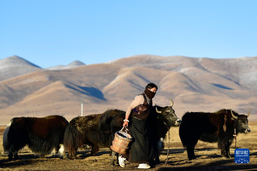 青海省玉樹藏族自治州稱多縣珍秦鎮(zhèn)二村牧民扎西德藏準(zhǔn)備給牦牛擠奶(2020年10月28日攝)。新華社記者 張龍 攝