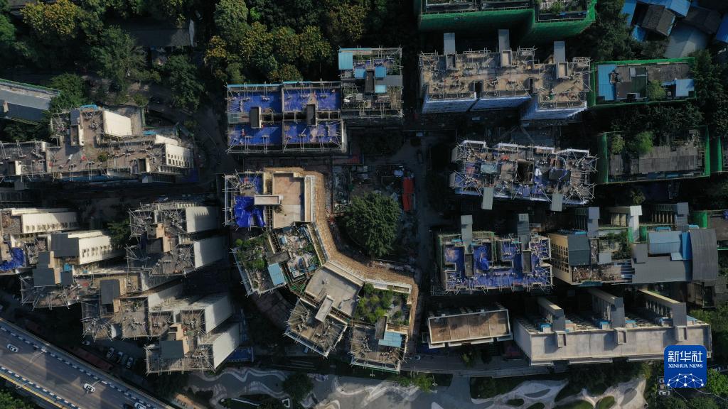 這是重慶市北碚區(qū)新房子片區(qū)老舊小區(qū)改造項(xiàng)目施工現(xiàn)場(chǎng)(2021年10月23日攝,無人機(jī)照片)。新華社發(fā)(秦廷富攝)