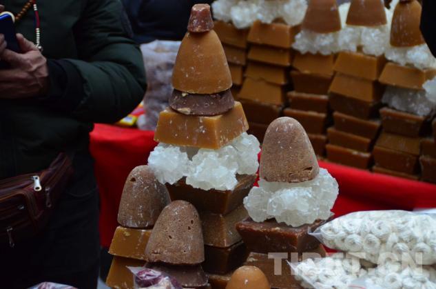 商城一層是一個年貨市場,一層一層壘起來的切瑪盒、不同顏色和形狀的卡塞、堆成寶塔形狀的紅糖、花盆里裝著的青稞苗……在那拿出皮尺量的,是在購買香布,藏歷新年到來時家家戶戶都會更換新的香布。