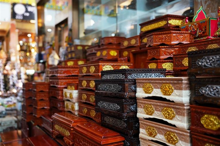 巴桑站在店門口展示著自家的切瑪盒,“我們家的切瑪盒做的可是一絕,而且不會因?yàn)榭爝^年了就胡亂加價(jià),50元至500元的都有,很多顧客都是從其他地方趕過來買。你看上面插的酥油花,這也是我父親做的,別看不大,每個都要兩三個小時(shí)才能做好?!卑蜕Uf。
