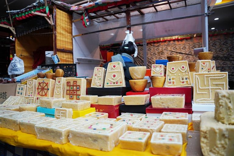 2月16日,記者來到拉薩市八廓商城與沖賽康市場。風(fēng)干肉、羅薩梅朵、卡賽、切瑪盒……攤位上各類年貨琳瑯滿目,一應(yīng)俱全,置辦年貨的人們?nèi)宄扇旱剡呑哌吿暨x自己中意的物品,準(zhǔn)備歡度藏歷新年。走進(jìn)八廓商城立馬便被里面熱鬧的場景所吸引,詢貨問價(jià)的聲音不絕于耳。走到攤前,不等顧客開口,店家便會熱情地推銷起自己的貨物。
