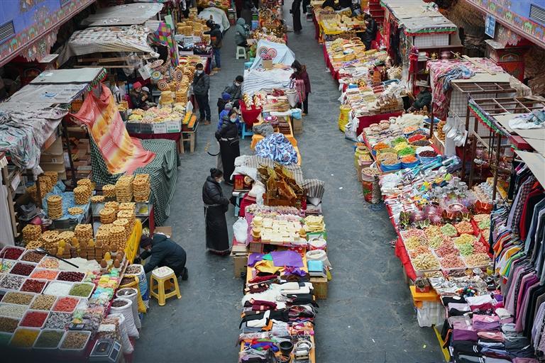 手持羅薩梅朵的小孩在大街小巷里歡笑;腳邊放置著大量年貨的顧客正和老板磋商著手中切瑪盒的價(jià)格;阿佳一手提著采購好的年貨,一手牽著孩子稚嫩的小手……在藏歷新年來臨之際,這座千年古城被喜氣洋洋的人群交織出了濃濃的煙火氣息。(圖/記者 阿旺尼瑪)