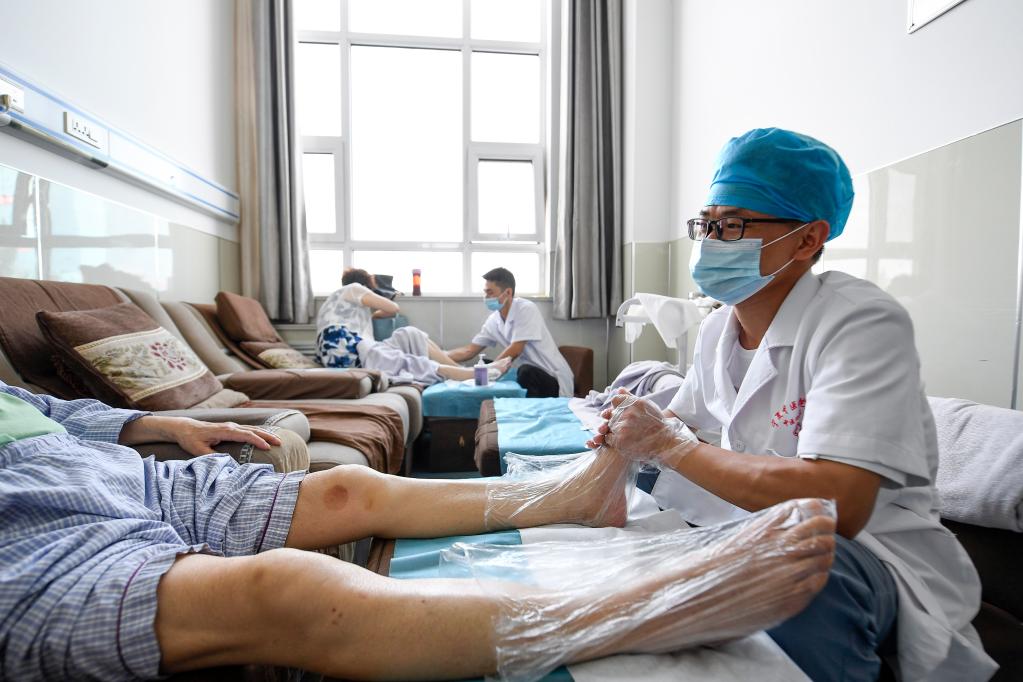 2021年7月11日,寧夏中醫(yī)醫(yī)院暨中醫(yī)研究院治未病中心醫(yī)師在為患者做足底反射療法。新華社記者 馮開華 攝