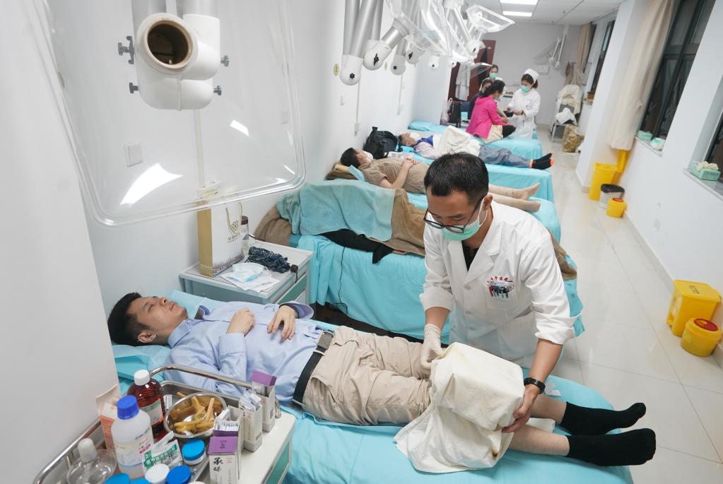 2020年6月5日,在江蘇省中醫(yī)院針灸康復(fù)科特色療法中心,醫(yī)護(hù)人員給市民進(jìn)行針灸治療。新華社記者 季春鵬 攝