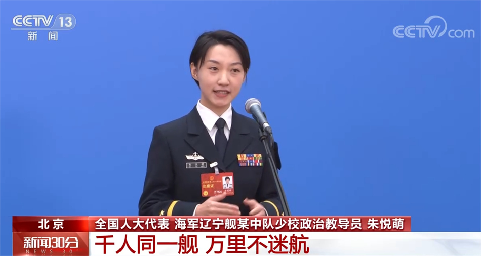 全國(guó)人大代表 海軍遼寧艦?zāi)持嘘?duì)少校政治教導(dǎo)員 朱悅萌:這10年里,我們遼寧艦從下水啟航、戰(zhàn)機(jī)上艦到遠(yuǎn)海部署,正在繪就大國(guó)重器更加深遠(yuǎn)、更加壯闊的奔涌航跡,我們把青春夢(mèng)想融入祖國(guó)的航母事業(yè),千人同一艦,萬(wàn)里不迷航,艦艏行處是長(zhǎng)城,國(guó)家利益所至,海軍航跡必達(dá)。