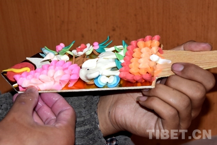酥油花是藏民族雕塑藝術的一種特殊形式,它是以人物、花卉、樹木、飛禽、走獸等為主題的一種手工油塑藝術,具有悠久的歷史。藏歷新年期間,西藏群眾會在切瑪盒的左右兩邊分別裝滿糌粑和炒青稞,然后在上面插上象征五谷豐登的“羅薩美朵”(彩色青稞穗)和寓意吉祥的酥油花。(中國西藏網 記者/次旦拉姆)