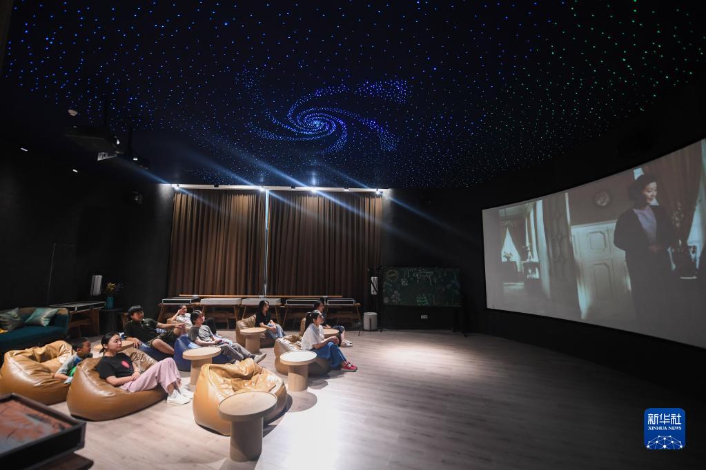 2022年7月2日,居民在位于浙江省杭州市富陽區(qū)銀湖街道硅谷社區(qū)的“合之舍”書房的影視廳內觀看電影。該書房是銀湖街道“15分鐘品質文化生活圈”的重要示范點位。新華社記者 徐昱 攝