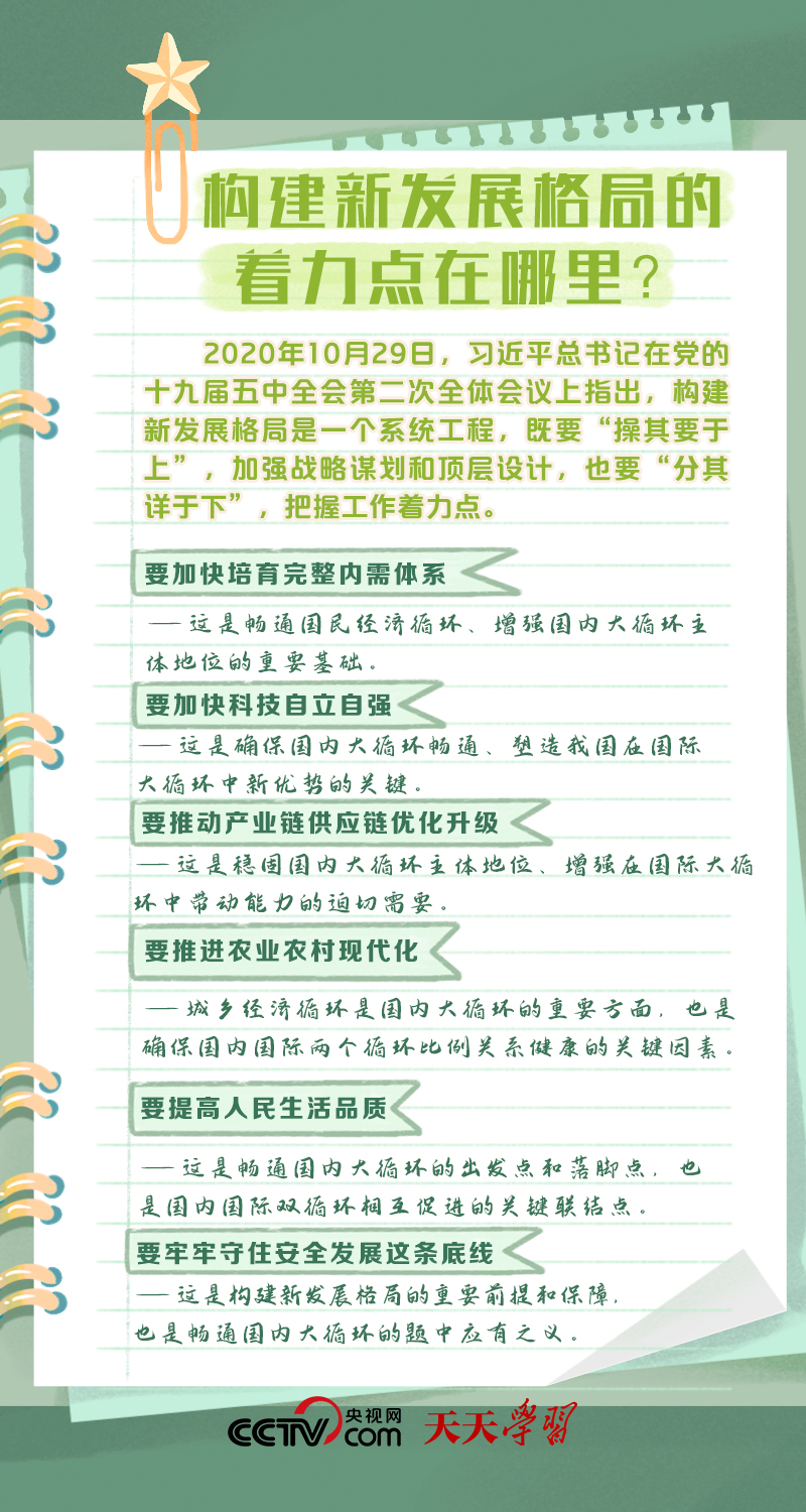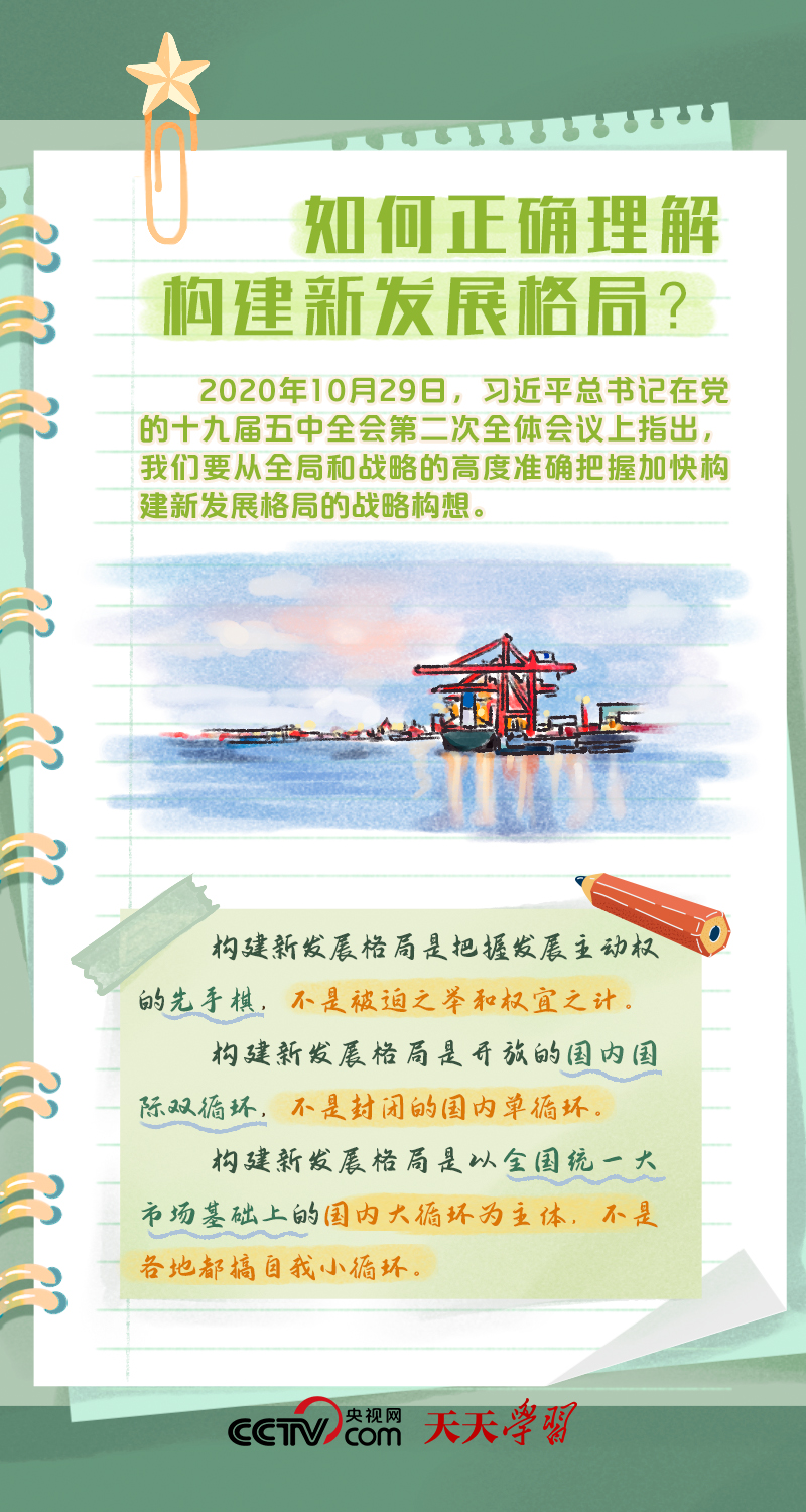 天天學(xué)習(xí)構(gòu)建以國內(nèi)大循環(huán)為主體、國內(nèi)國際雙循環(huán)相互促進(jìn)的新發(fā)展格局,是根據(jù)我國發(fā)展階段、環(huán)境、條件變化,特別是基于我國比較優(yōu)勢變化,審時(shí)度勢作出的重大決策。構(gòu)建新發(fā)展格局是事關(guān)全局的系統(tǒng)性、深層次變革,是立足當(dāng)前、著眼長遠(yuǎn)的戰(zhàn)略謀劃。