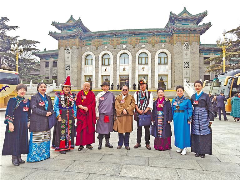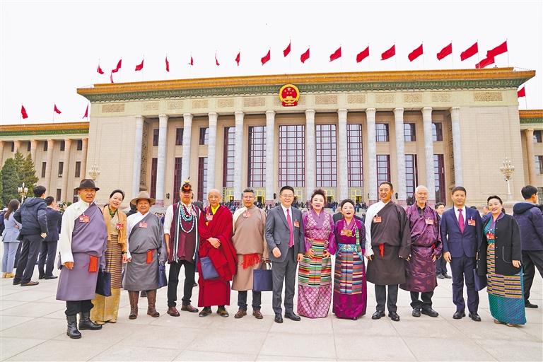 圖為住藏全國政協(xié)委員們身著盛裝、滿懷豪情,在人民大會堂前合影留念。