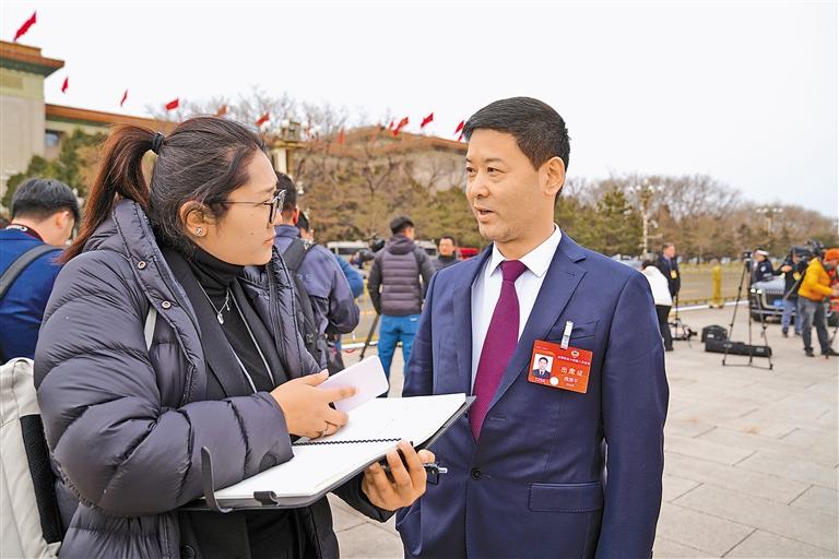 圖為記者在會議開幕前采訪住藏全國政協(xié)委員魏博平(右)。