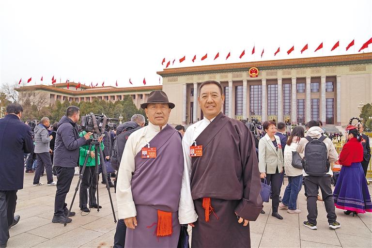圖為住藏全國政協(xié)委員尼瑪瓊拉(左)、勉沖·羅布斯達(dá)(右)在人民大會堂前合影。