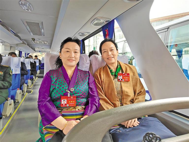 圖為住藏全國政協(xié)委員巴桑卓瑪(左)、 花德米(右)乘車前往會場。