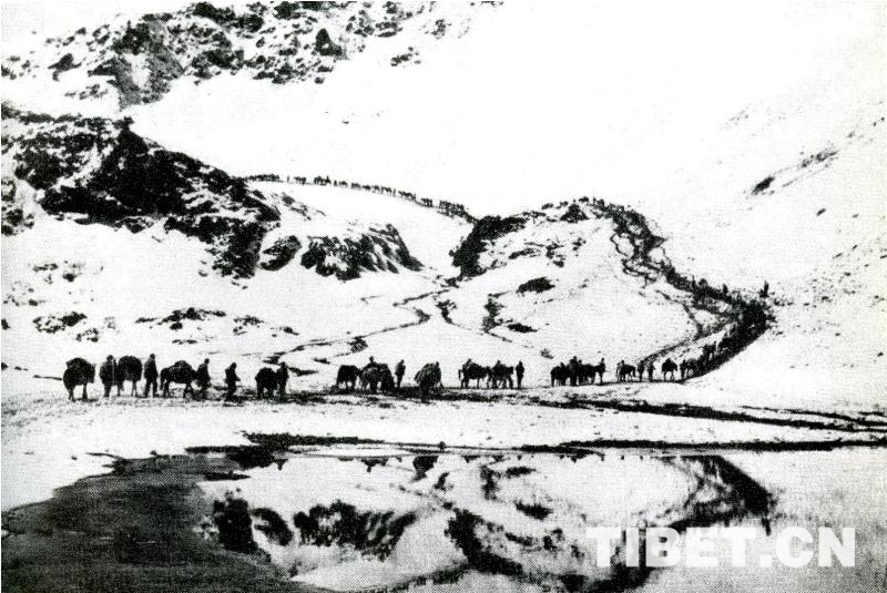 圖為1951年10月,進藏部隊越過海拔六千余米的冷拉大雪山向拉薩前進