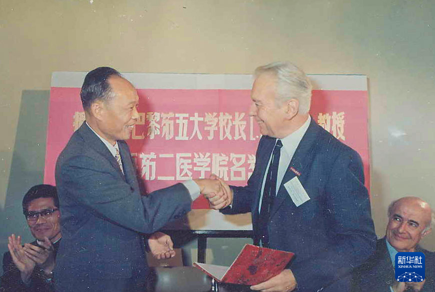 上海第二醫(yī)學(xué)院(現(xiàn)上海交通大學(xué)醫(yī)學(xué)院)校長(zhǎng)王振義(前左)授予法國(guó)巴黎第五大學(xué)校長(zhǎng)歐基埃名譽(yù)教授稱(chēng)號(hào)(攝于1985年)。新華社發(fā)(上海交通大學(xué)醫(yī)學(xué)院供圖)