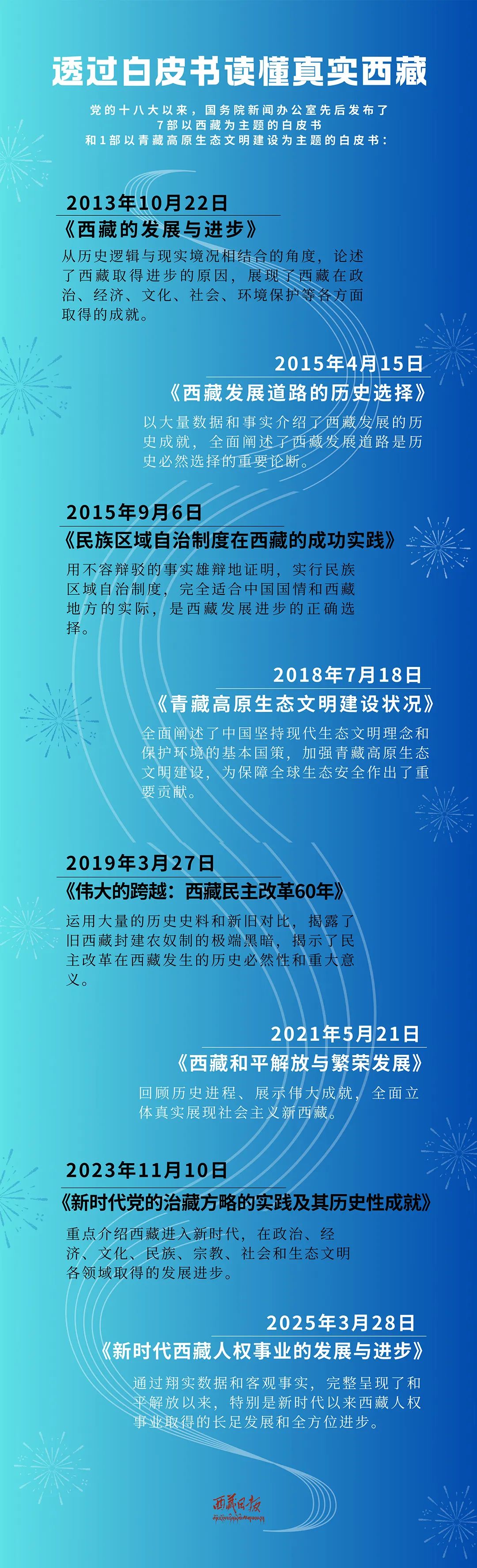 2023年發(fā)布《新時(shí)代黨的治藏方略的實(shí)踐及其歷史性成就》白皮書,系統(tǒng)總結(jié)和全面闡述了在新時(shí)代黨的治藏方略引領(lǐng)下,西藏在政治、經(jīng)濟(jì)、文化、民族、宗教、社會(huì)和生態(tài)文明各領(lǐng)域取得的發(fā)展進(jìn)步。新時(shí)代西藏的發(fā)展與進(jìn)步,充分證明了新時(shí)代黨的治藏方略是完全正確的。