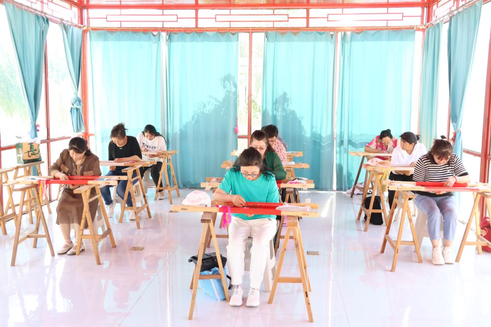 在古色古香的蒙古族刺繡車間內(nèi),繡娘們一會兒飛針走線,一會兒相互聊天,漢族繡工向蒙古族繡工傳授經(jīng)驗,蒙古族繡工又向朝鮮族繡工分享技藝,大家切磋工作、聊聊家常,氛圍和諧。
