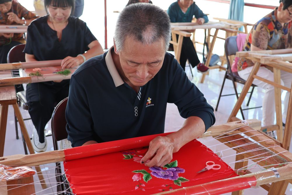 車間里,來自不同民族的繡工在交流和學(xué)習(xí)中,不僅精進(jìn)了繡法,也在傳承中華優(yōu)秀傳統(tǒng)文化中找到了更多共鳴,“同心同圓”等象征民族團(tuán)結(jié)的繡品表達(dá)著他們的心聲。