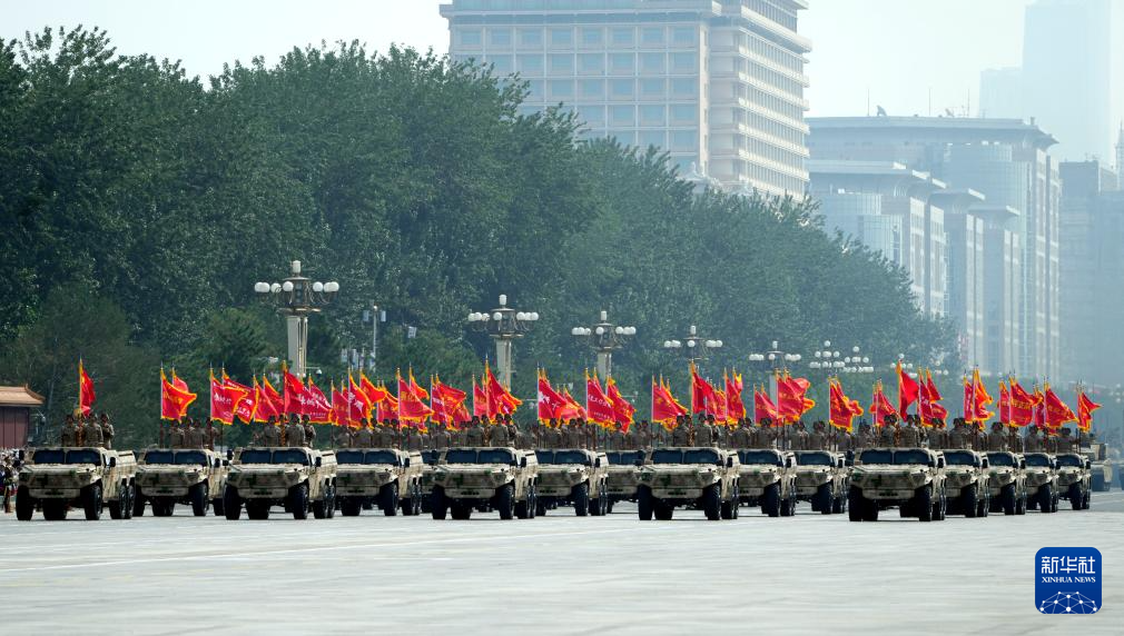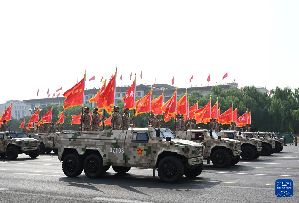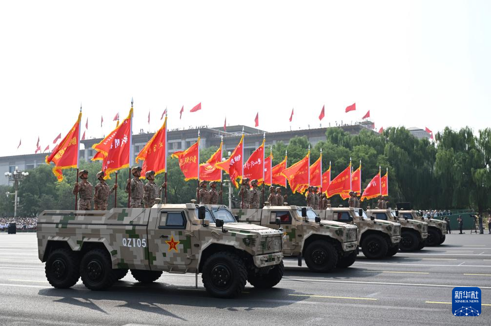 9月3日,紀(jì)念中國人民抗日戰(zhàn)爭暨世界反法西斯戰(zhàn)爭勝利80周年大會在北京隆重舉行。這是戰(zhàn)旗方隊行進(jìn)在長安街上。