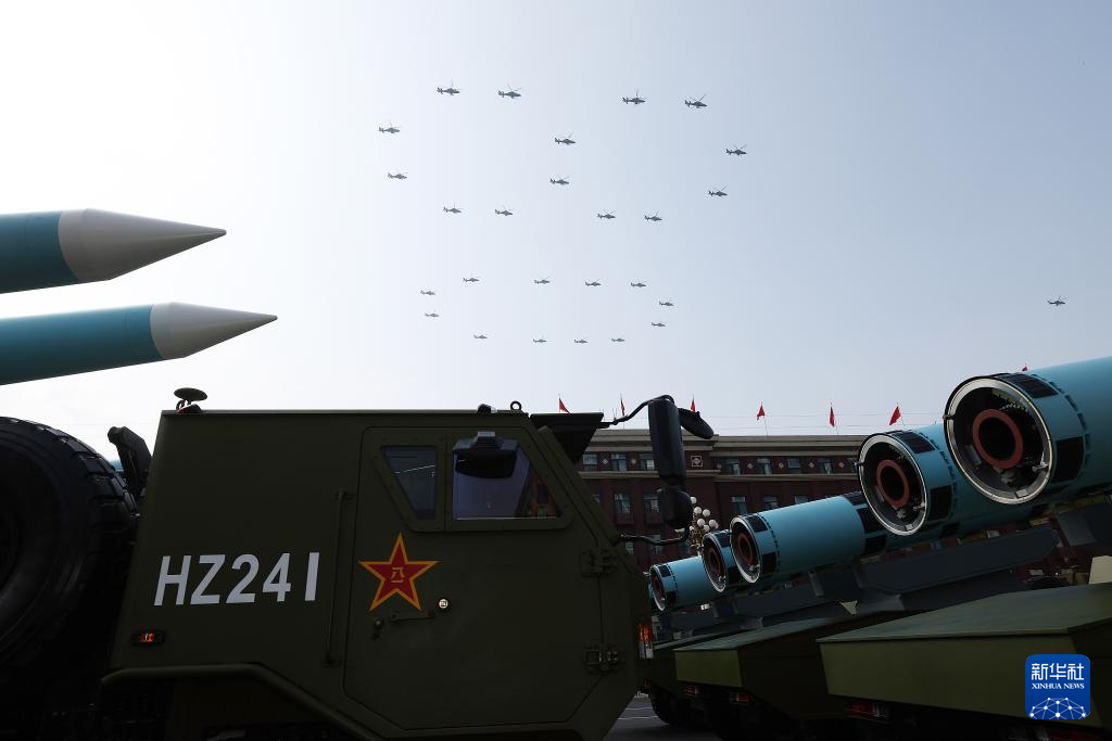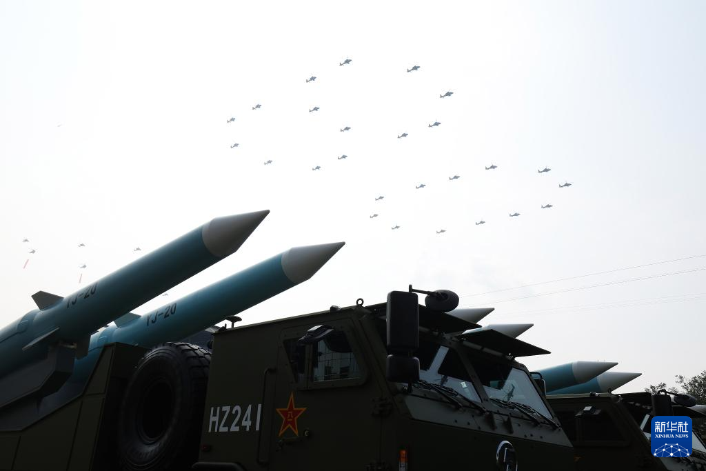9月3日,紀(jì)念中國人民抗日戰(zhàn)爭暨世界反法西斯戰(zhàn)爭勝利80周年大會在北京隆重舉行。這是空中護(hù)旗梯隊從反艦導(dǎo)彈方隊上空飛過。