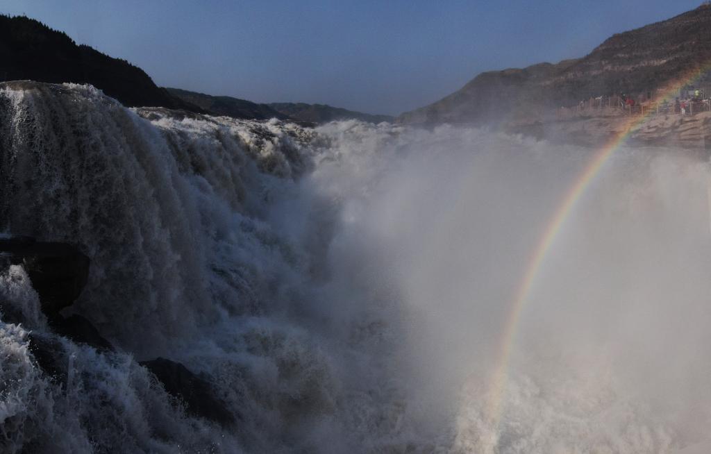 3月3日,黃河水從黃河壺口瀑布傾瀉而下,水霧中,一道絢麗的彩虹清晰可見。(呂桂明 攝)
