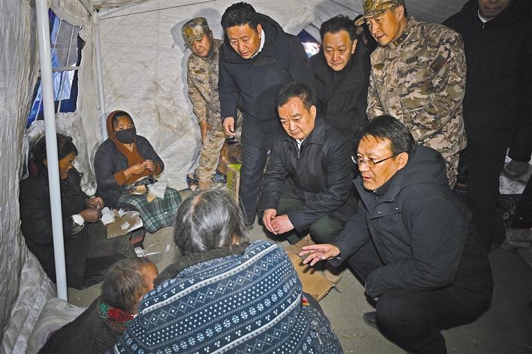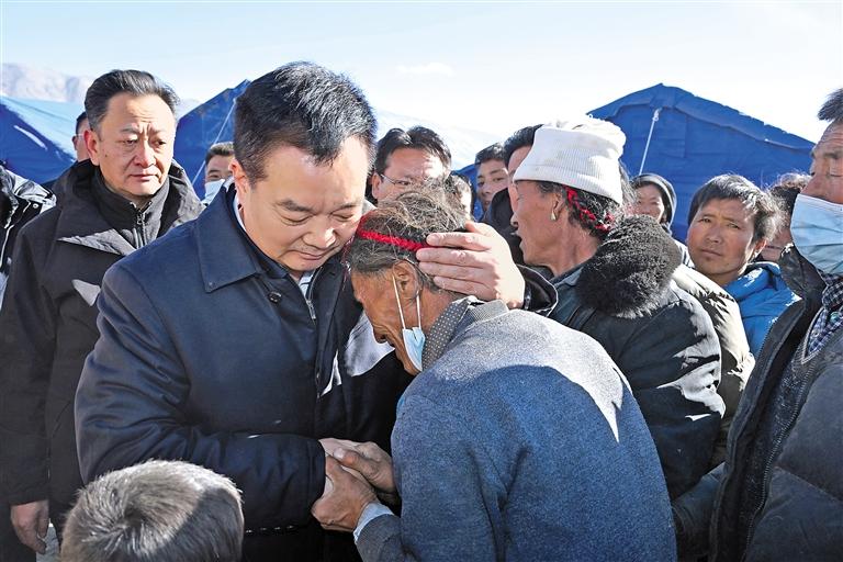 每到一處,王君正都向群眾轉(zhuǎn)達(dá)習(xí)近平總書記和黨中央、中央領(lǐng)導(dǎo)同志的關(guān)心關(guān)懷,告訴群眾相信有習(xí)近平總書記的關(guān)心關(guān)懷,我們就沒有克服不了的困難。當(dāng)受災(zāi)群眾聽到習(xí)近平總書記和中央領(lǐng)導(dǎo)同志的關(guān)心關(guān)懷,大家十分激動,許多群眾流下了感動的淚水,對抗震救災(zāi)、重建家園燃起了信心?!拔覀兙褪菗?dān)心老人孩子晚上受凍感冒?!碑?dāng)聽到災(zāi)區(qū)群眾的擔(dān)心時,王君正說:“你們的擔(dān)心正是我們的擔(dān)心?!碧鞛?zāi)無情、人有情。在安置點(diǎn)上,王君正鼓勵受災(zāi)群眾堅定信心,黨和政府一定會全力以赴開展抗震救災(zāi),大家要團(tuán)結(jié)一心、互幫互助,克服暫時的困難,加強(qiáng)統(tǒng)一規(guī)劃、重建新家園,齊心協(xié)力共建社會主義新農(nóng)村。晚上六點(diǎn)三十分許,海拔4400米的安置點(diǎn)上寒風(fēng)凜冽,看見已有帳篷陸陸續(xù)續(xù)搭建起來,王君正叮囑受災(zāi)群眾趕緊到帳篷里取暖,不要受涼受凍。他要求相關(guān)部門,要深刻認(rèn)識災(zāi)區(qū)地處高海拔區(qū)域的特殊情況,把受災(zāi)群眾御寒保暖工作擺在更加突出位置,加緊調(diào)集棉帳篷、棉衣、棉被、烤火爐等物資,加快帳篷安裝進(jìn)度,確保受災(zāi)群眾吃上熱飯、喝上熱水、住上帳篷、溫暖過夜、感受親情。要嚴(yán)防發(fā)生次生災(zāi)害,全面排查房屋受損情況,對嚴(yán)重受損的建筑嚴(yán)格管控,強(qiáng)化巡查值守,做好安全防范工作,嚴(yán)防火災(zāi),抓好衛(wèi)生防疫,配備預(yù)防流感等藥物,加強(qiáng)食品和飲用水衛(wèi)生監(jiān)管,堅決維護(hù)災(zāi)區(qū)社會穩(wěn)定。要充分發(fā)揮基層黨組織戰(zhàn)斗堡壘作用和黨員先鋒模范作用,落實(shí)落細(xì)黨中央和自治區(qū)抗震救災(zāi)各項安排部署,主動同受災(zāi)群眾吃住在一起,用心用情解決困難,引導(dǎo)受災(zāi)群眾開展自救、互幫互助,讓黨旗在抗震救災(zāi)一線高高飄揚(yáng)。黨政軍警民要協(xié)調(diào)聯(lián)動,解放軍、武警、消防、邊檢和地方各救援力量要統(tǒng)一指揮、統(tǒng)一調(diào)度、加強(qiáng)協(xié)同、密切合作,齊心協(xié)力抓好抗震救災(zāi)工作。