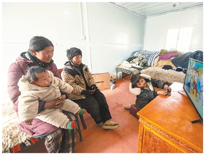 就在前一天,次仁普尺一家已經(jīng)住進(jìn)了溫暖的板房。幾個(gè)弟弟正擠在電視機(jī)前爭(zhēng)搶遙控器,吵著要看各自喜歡的動(dòng)畫片;媽媽巴桑則在一旁細(xì)心整理著被褥和衣物,將一件件物品歸置妥當(dāng)。