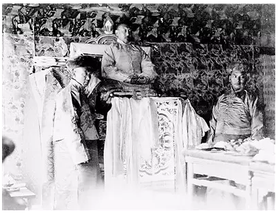 圖為1935年,九世班禪額爾德尼·曲吉尼瑪(中)在內(nèi)蒙古各地為僧眾祈禱祝福 圖片來(lái)源:中國(guó)之聲公眾號(hào)