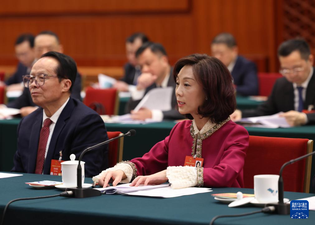 3月5日,全國人大代表袁姝在貴州代表團全體會議上發(fā)言。當(dāng)日下午,十四屆全國人大三次會議各代表團舉行全體會議,審議政府工作報告。新華社記者 翟健嵐 攝