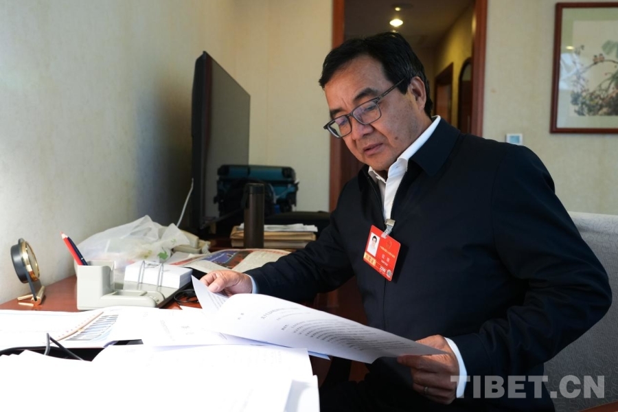 全國人大代表、西藏大學生態(tài)環(huán)境學院教授拉瓊在駐地看文件