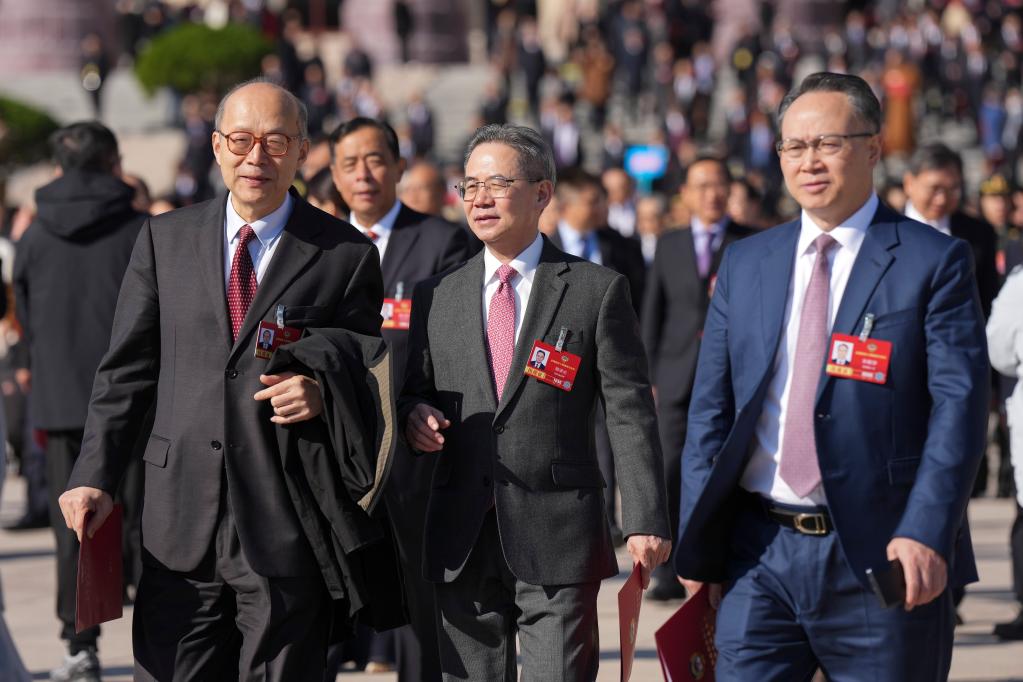 3月11日,全國政協十四屆四次會議在北京人民大會堂舉行閉幕會。這是閉幕會后,委員們走出人民大會堂。新華社記者 李明剛 攝