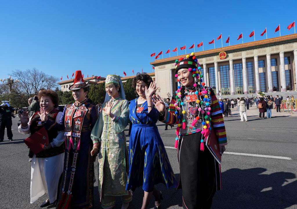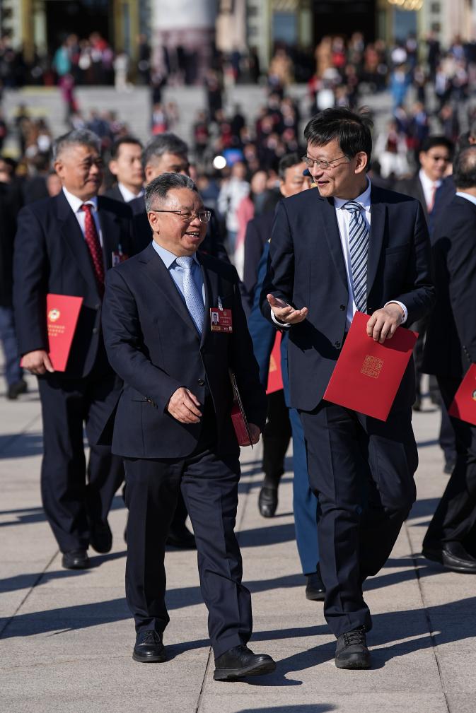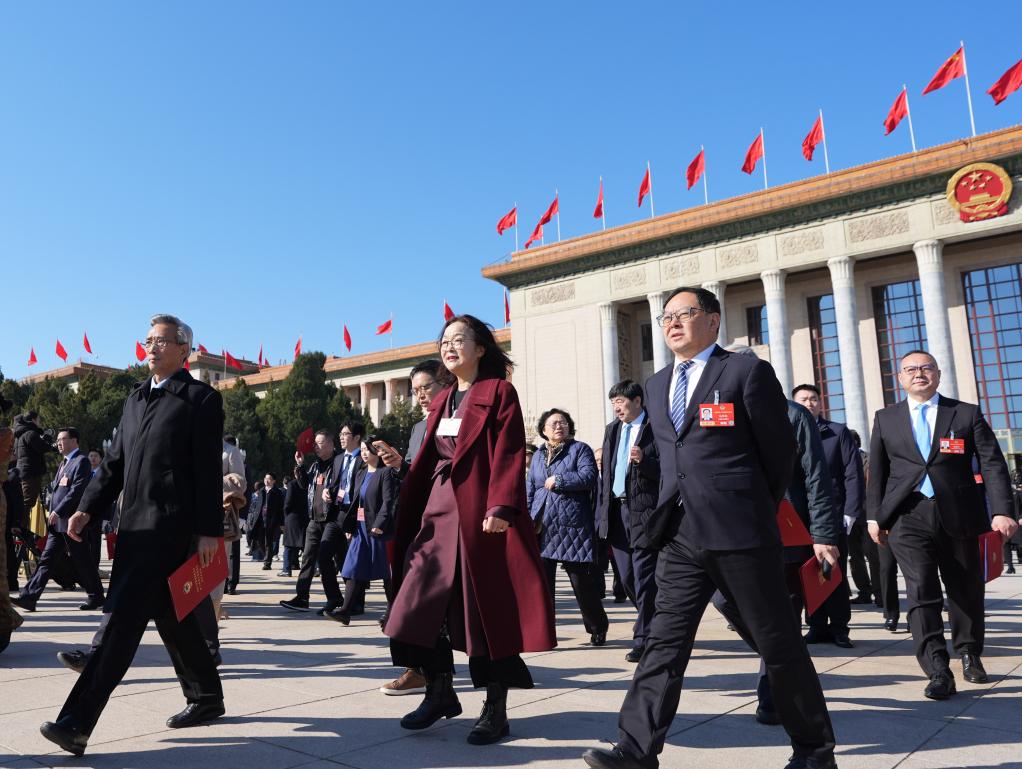3月11日,全國政協十四屆四次會議在北京人民大會堂舉行閉幕會。這是閉幕會后,委員們走出人民大會堂。新華社記者 王曦 攝