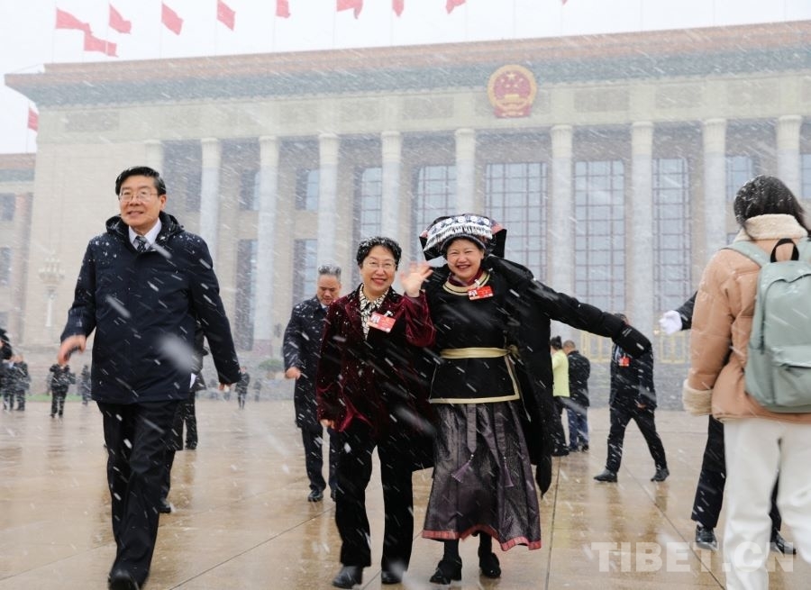 3月4日上午,十四屆全國人大四次會議舉行預(yù)備會議。會后,一場春雪不期而至。走出會場的全國人大代表、廣西金秀瑤族自治縣桐木中學(xué)副校長梁麗斌向記者們揮手致意。