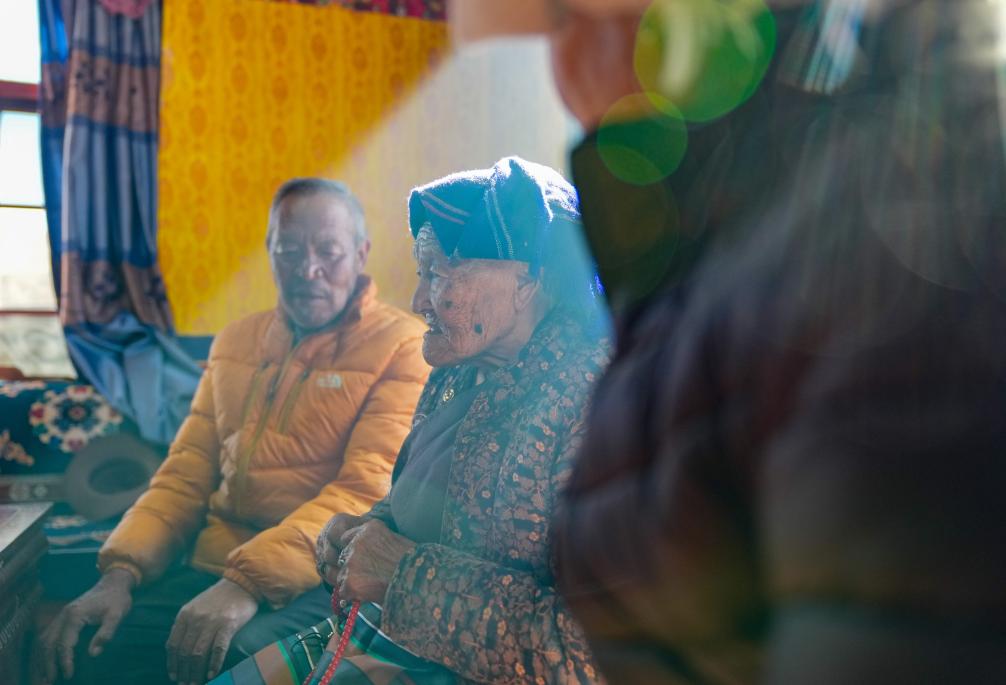 貢覺(jué)曲珍(中)和家人在家中聊天(3月6日攝)。