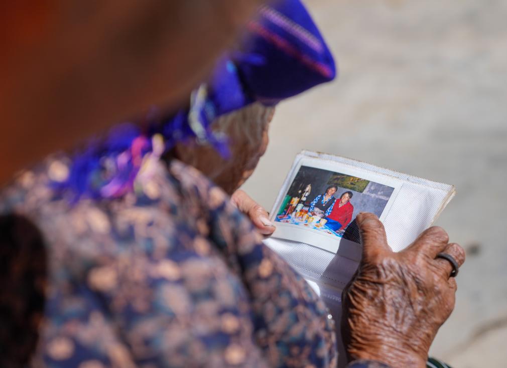 貢覺(jué)曲珍在家中翻看相冊(cè)(3月6日攝)。