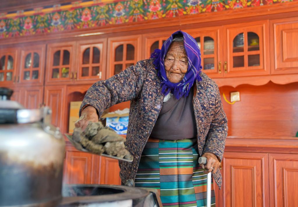 貢覺(jué)曲珍在家中給爐子添牛糞(3月6日攝)。